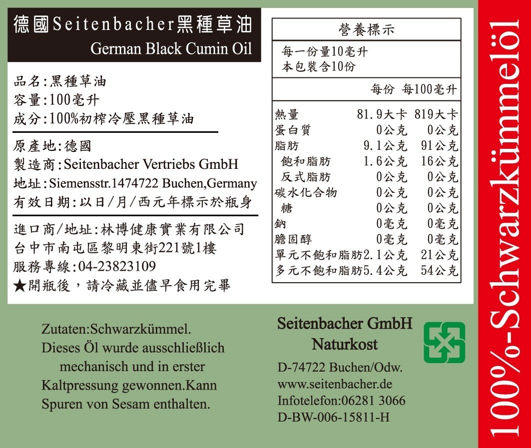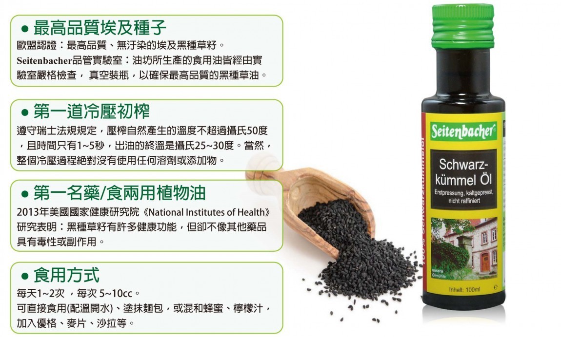 Seitenbacher Cold Pressed Black Cumin Oil ㊣原裝進口 ㊣100%歐盟認證埃及原生種壓 ㊣三百年冷壓工藝 ㊣百種以上活性成分、植物固醇、類黃酮等 ㊣通過台灣SGS473檢測