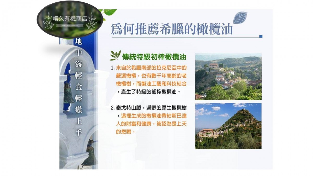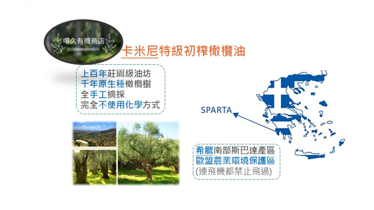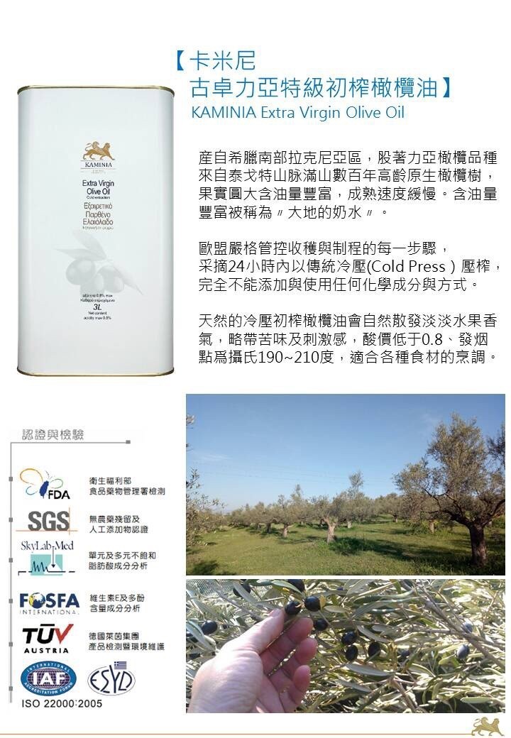 橄欖油中最高等級 原產地希臘南端卡拉馬塔產區,直接由希臘農莊供應、確保手工初榨等級。產品皆為歐盟高規格Extra virgin標準。