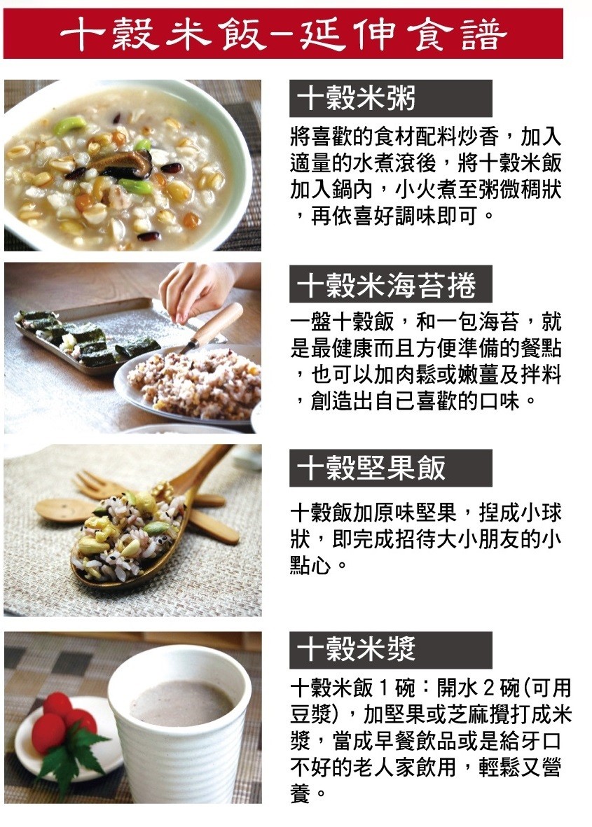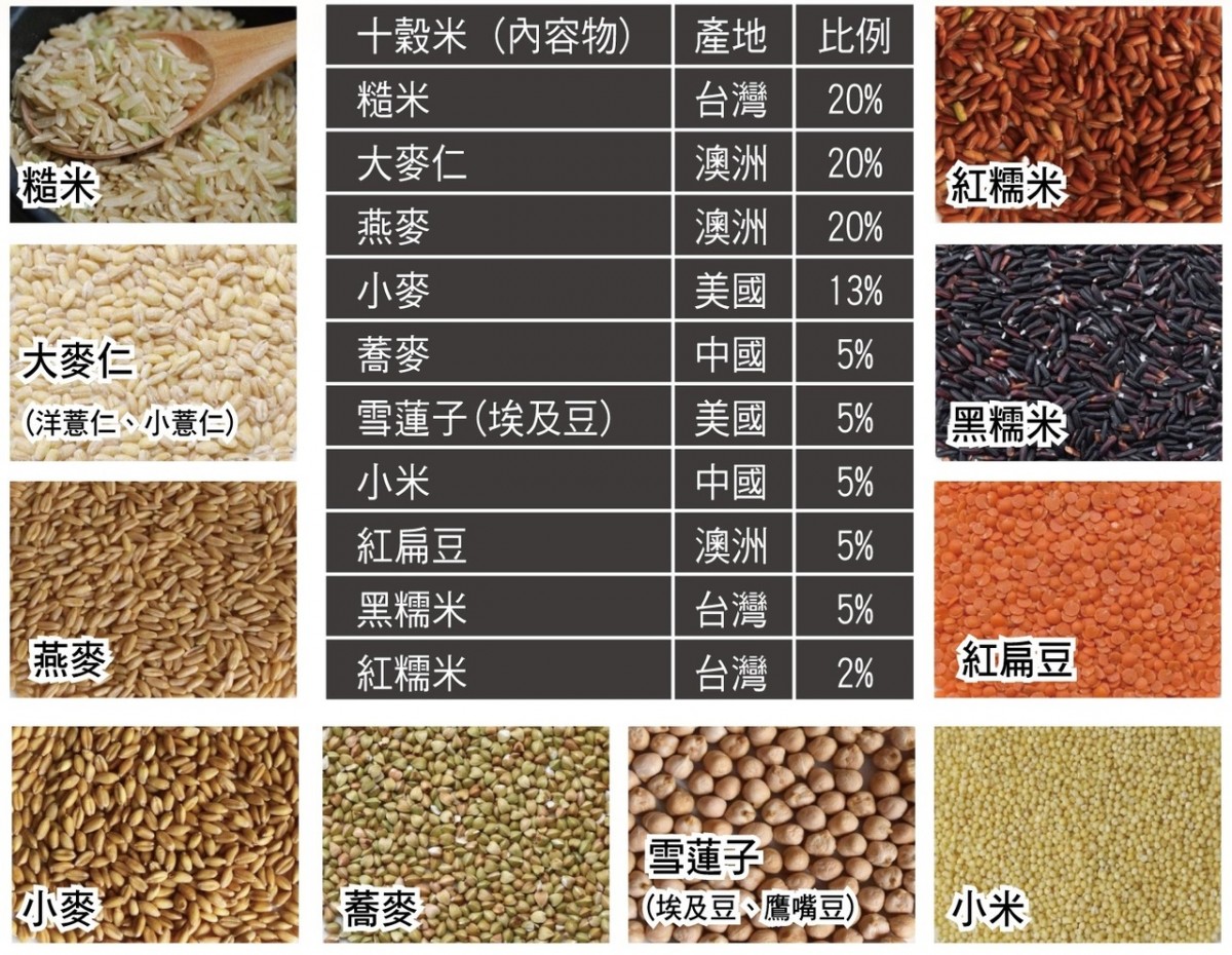 2.巿售十穀米的糙米比例大多50%以上 ,本產品的糙米比例在20%,依各項穀物口感均衡搭配,營養口感兼顧。